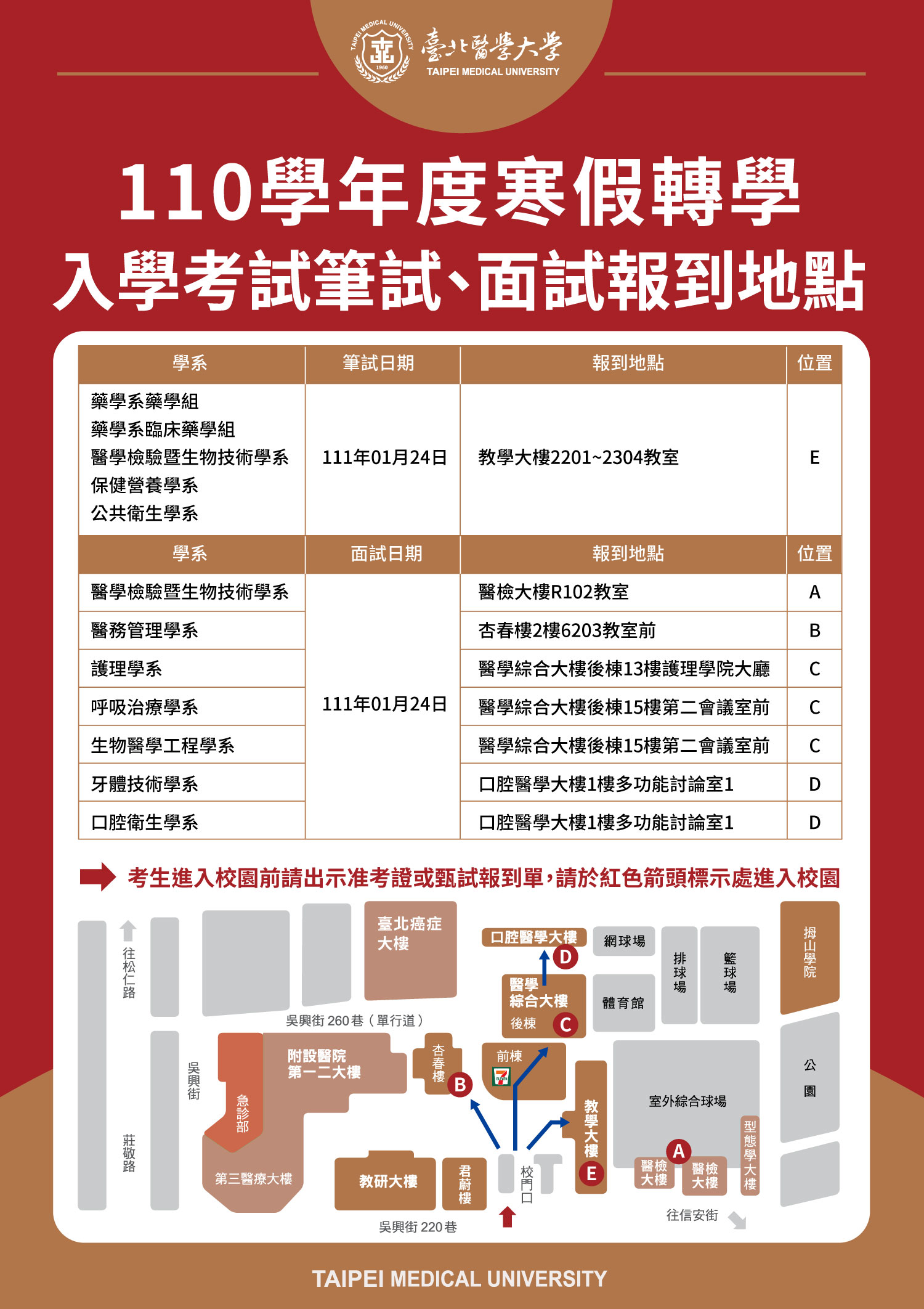 - 目前校園實施出入口管制,因應疫情與顧及考生健康,請考生全程配戴口罩從本校正門口進入校園,並出示甄試報到單,敬請考生配合防疫措施。