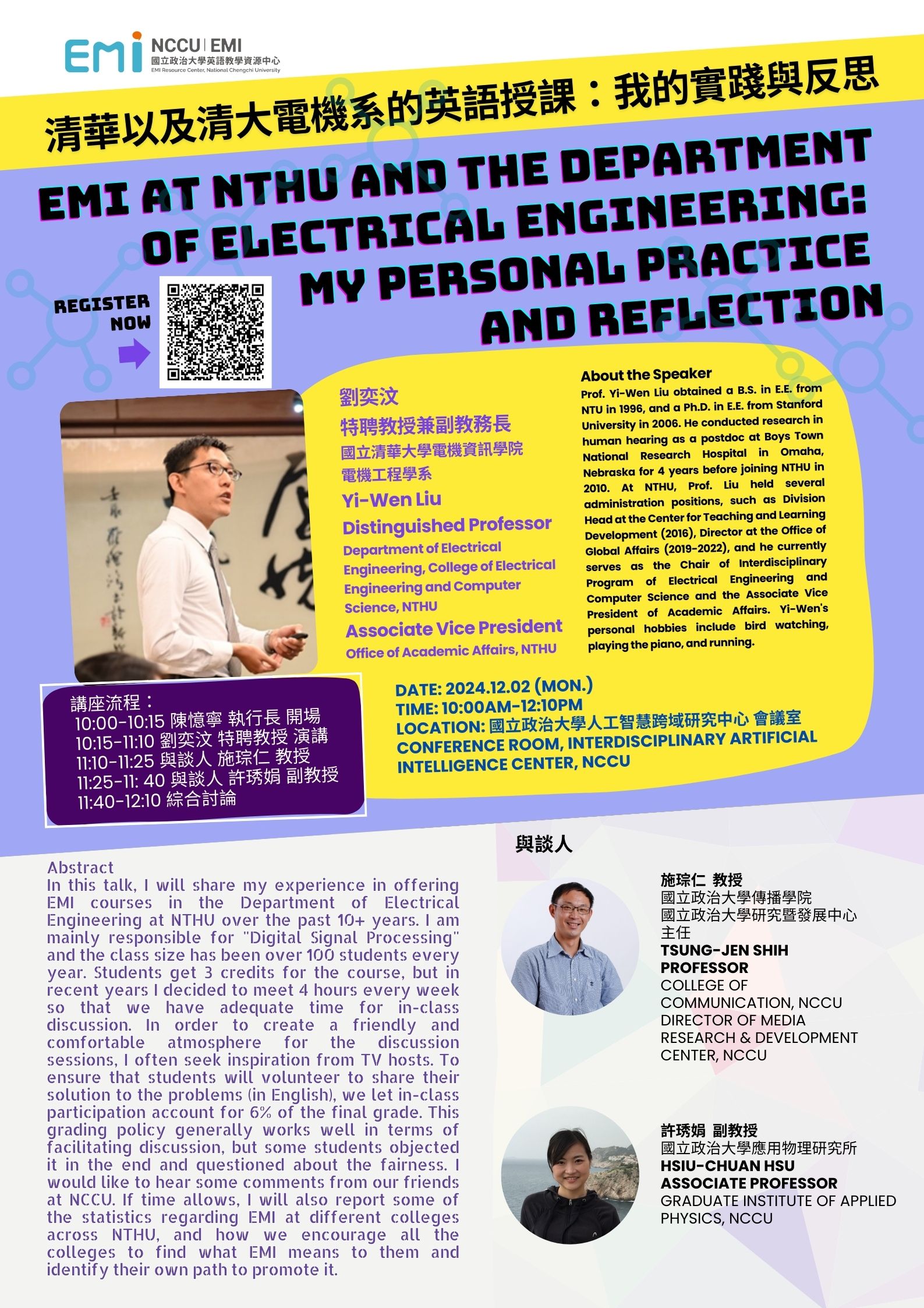 (二)演講主題:清華以及清大電機系的英語授課:我的實踐與反思 EMI at NTHU and the Department of Electrical Engineering: My Personal Practice and Reflection