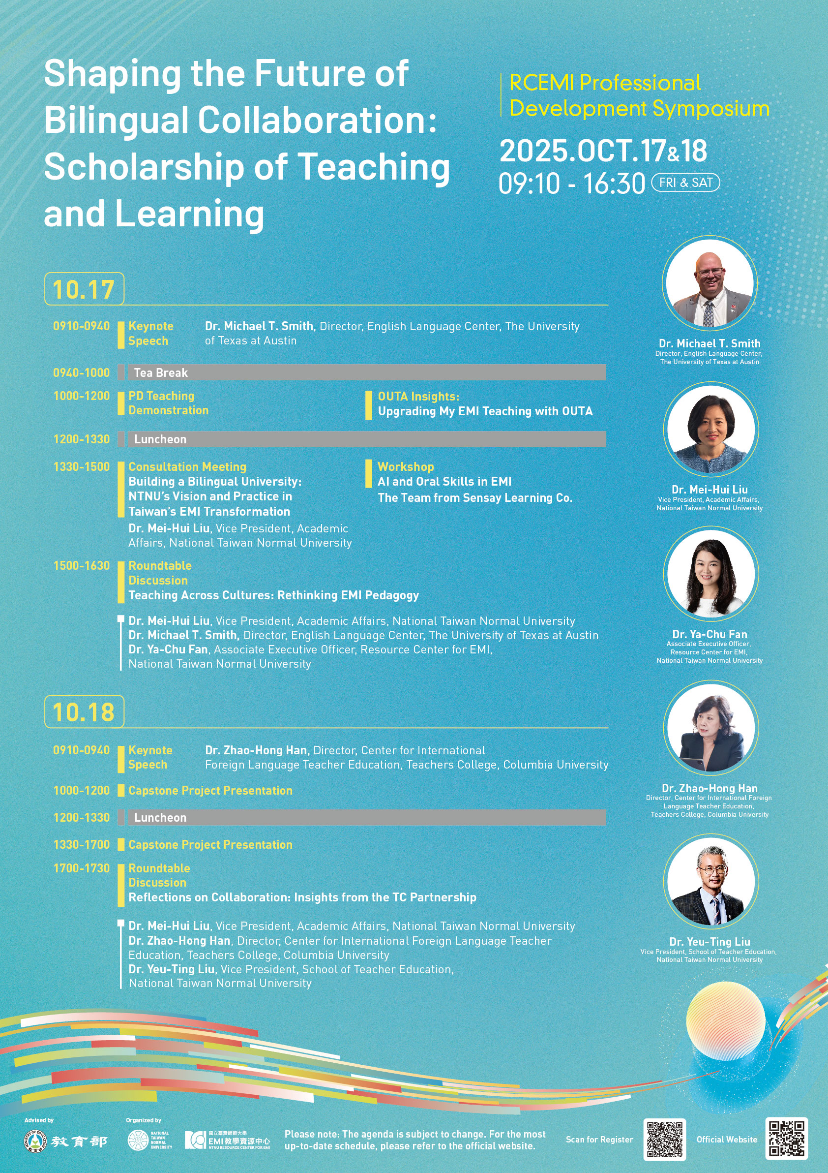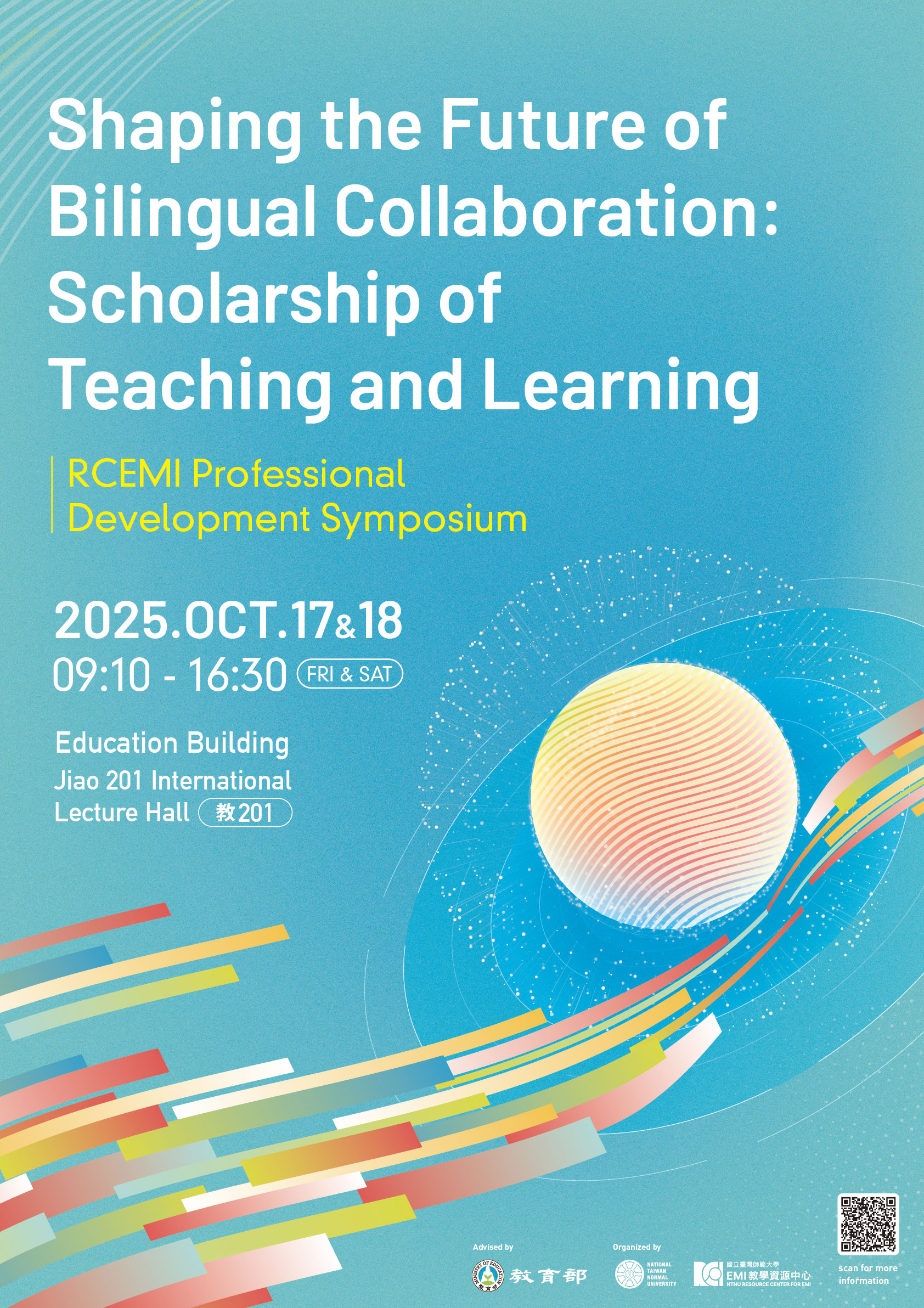 國立臺灣師範大學EMI教學資源中心主辦「Shaping the Future of Bilingual Collaboration: Scholarship of Teaching and Learning」成果發表暨研討會,旨在促進不同專業領域教師分享學習成果與 EMI 授課經驗,深化交流互動。研討會內容包括赴美國哥倫比亞大學師範學院移地訓練、赴美國德州大學奧斯汀分校移地訓練以及參與本中心36 小時EMI 教學增能課程之學員成果發表。同時設有兩場專題講座及EMI綜合座談,探討EMI理論與實務的結合、教學應用、課程設計,並探討AI於EMI教學實踐應用之助力。