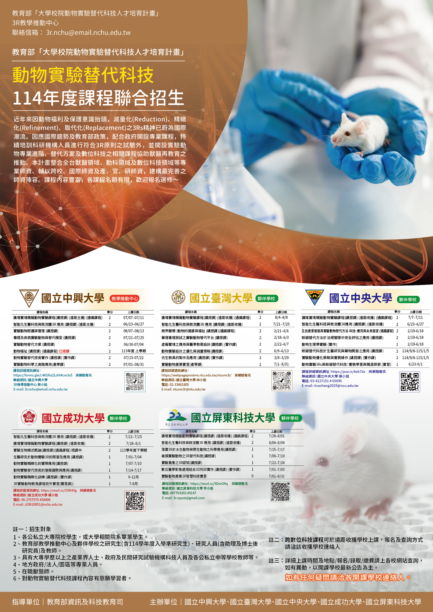 一、教育部動物實驗替代科技114年度課程聯合招生,伙伴學校包含國立中興大學、國立臺灣大學、國立中央大學、國立成功大學、國立屏東科技大學。