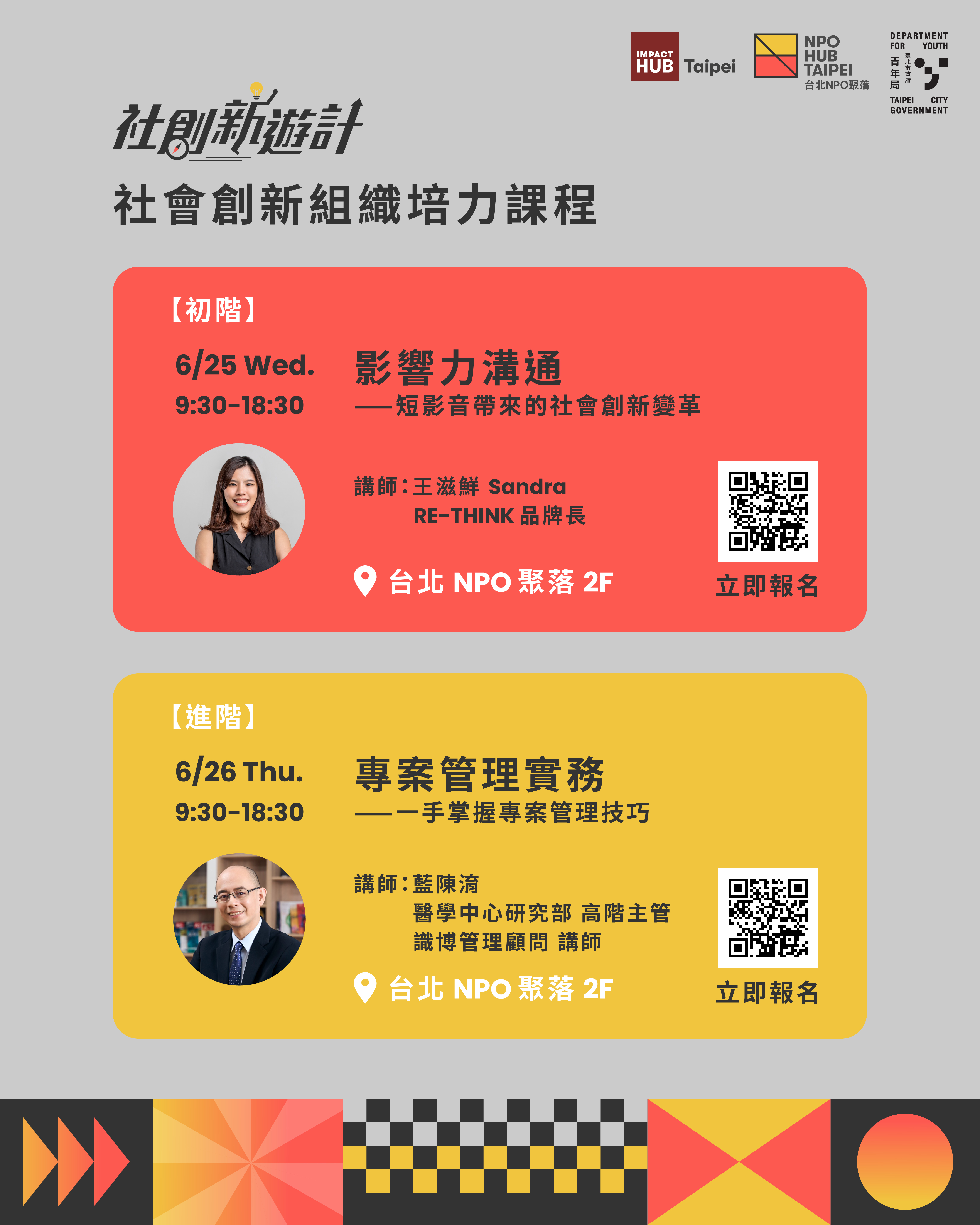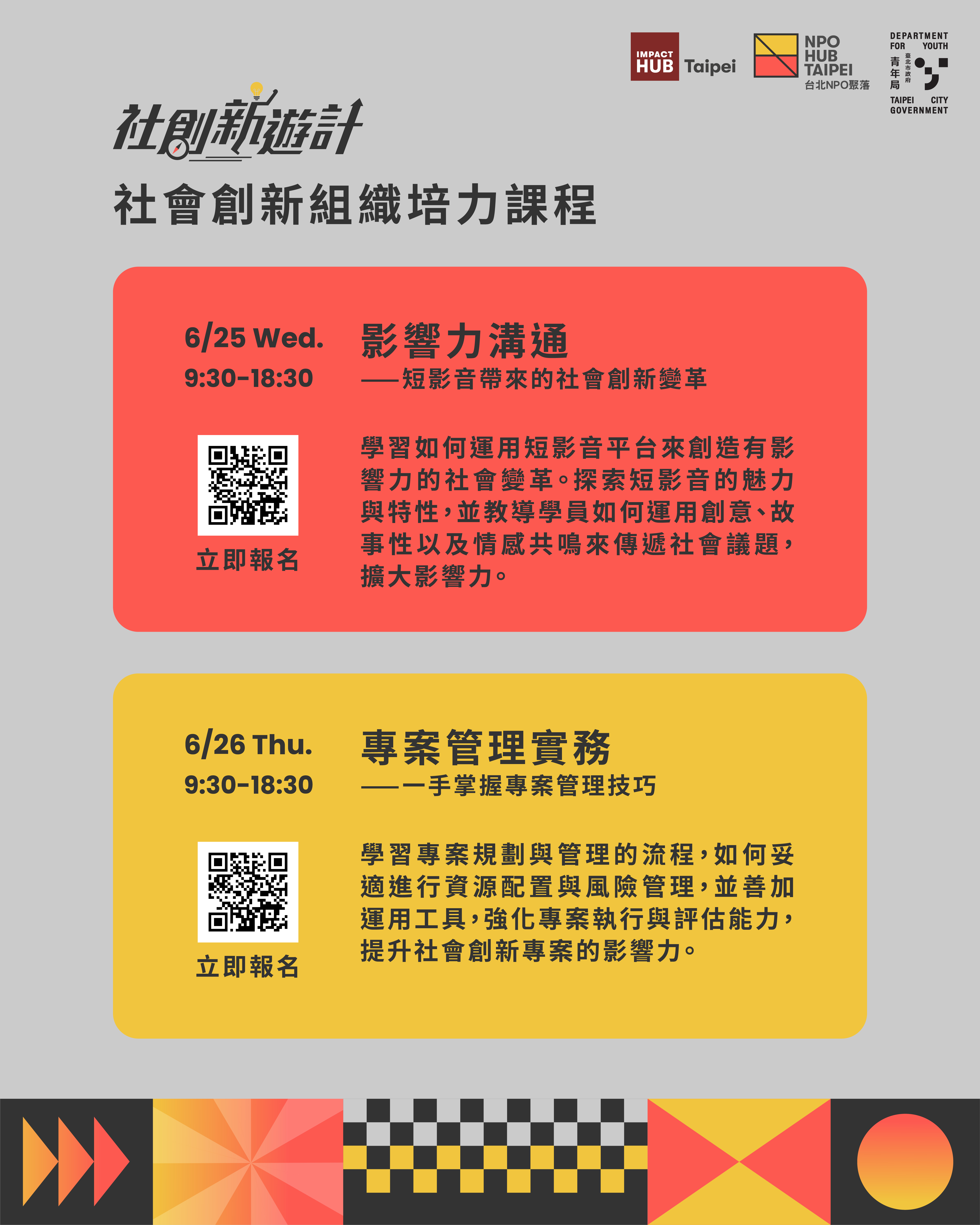 臺北市政府青年局支持青年投入社會創新工作,並鼓勵建立和發展社會創新組織,推出「社會創新組織培力課程」,幫助青年朋友將創新想法轉化為可行方案,提升社會影響力。歡迎所有對社會創新有興趣的青年朋友踴躍報名。