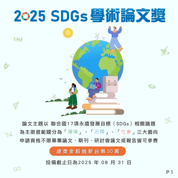 【敬邀參與】2025 SDGs學術論文獎,總獎金超過30萬元 !! 歡迎有興趣之研究生,踴躍報名參加!!
