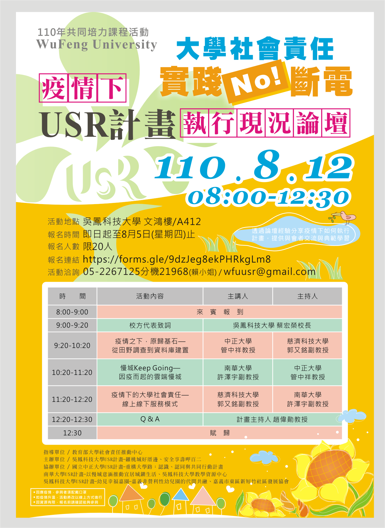- 報名方式:採線上報名,即日起至110年8月5日止( https://forms.gle/9dzJeg8ekPHRkgLm8)。