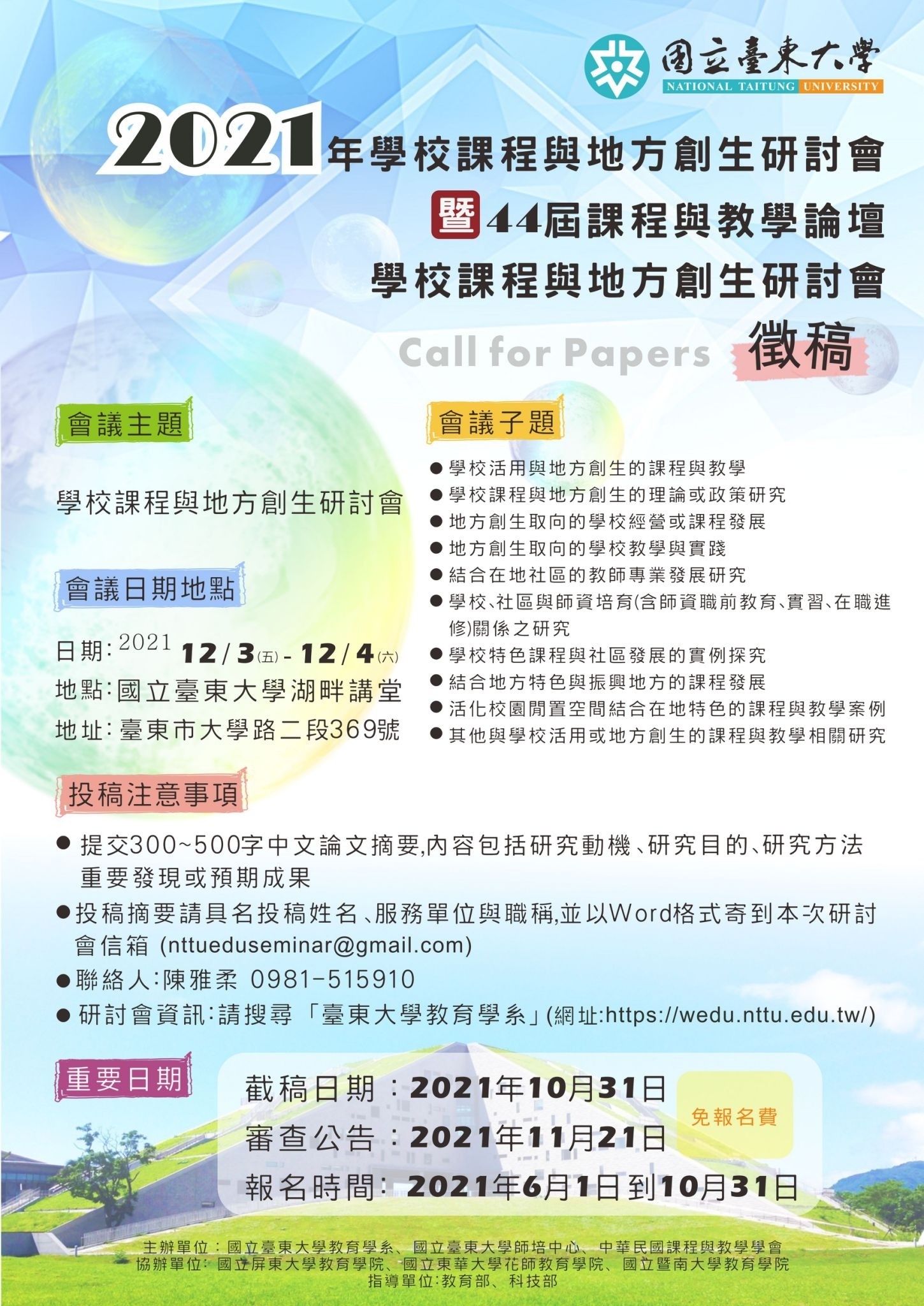 - 聯絡資訊:陳雅柔小姐,手機:0981-515910,投稿信箱:nttueduseminar@gmail.com。